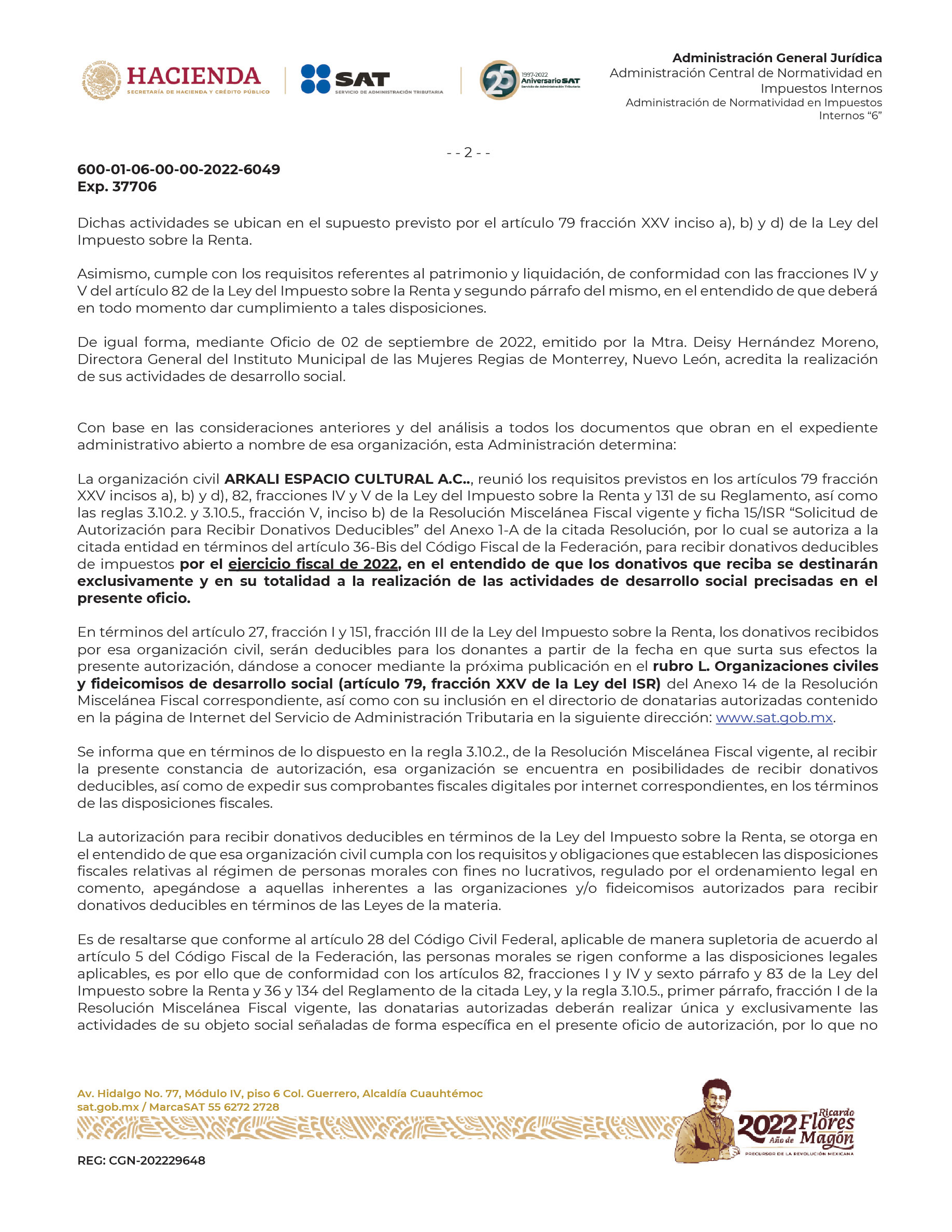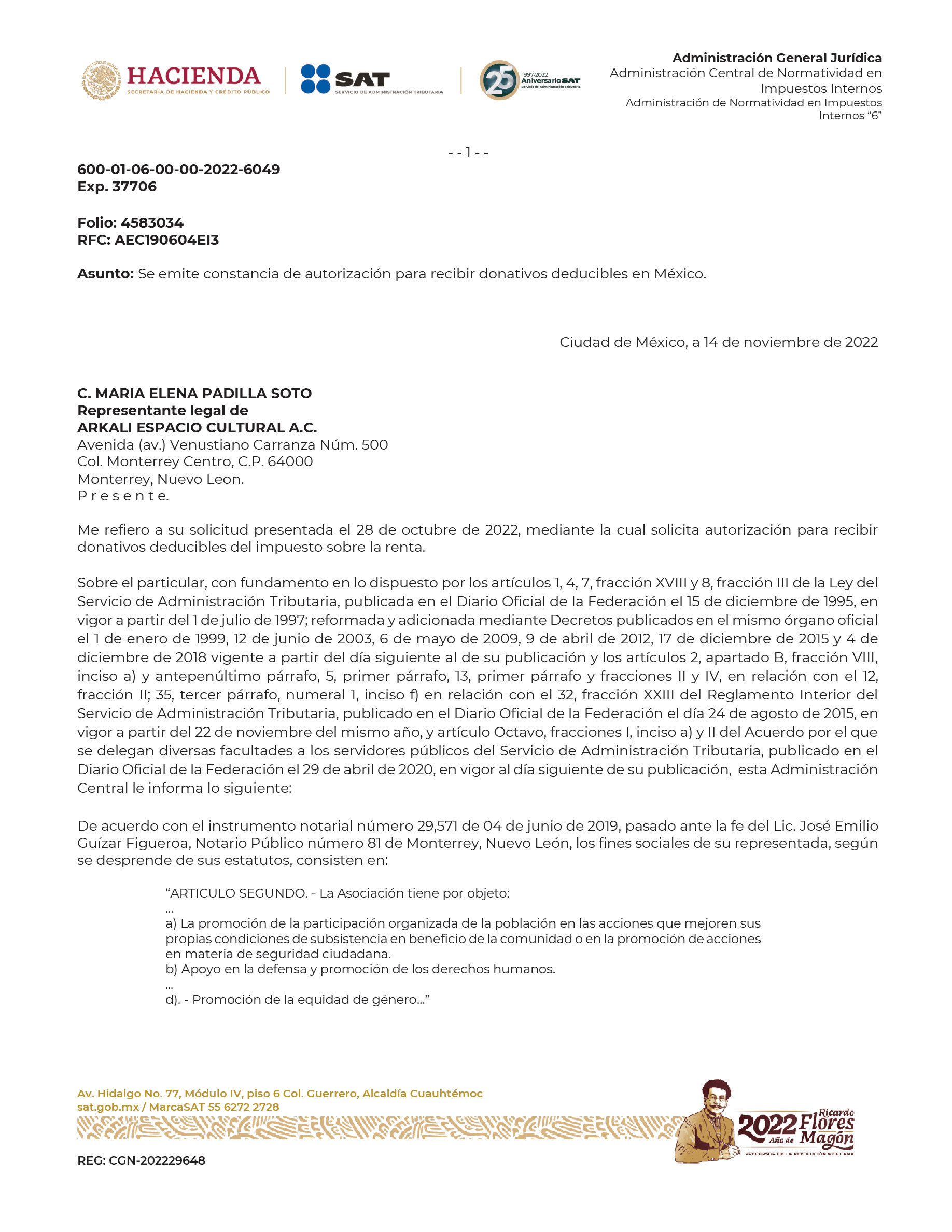 Previo a realizar el donativo, envíanos tu nombre, correo, celular y Constancia de Situación Fiscal a arkali.espaciocultural@gmail.com